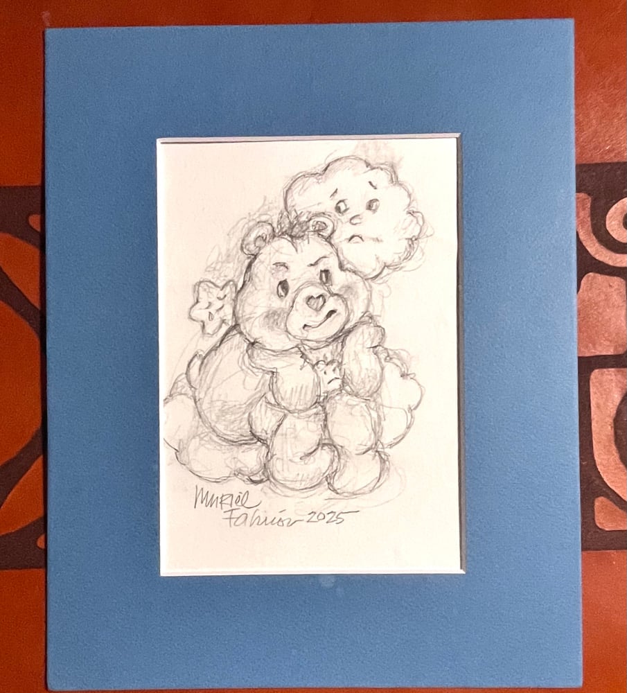 5 x 7 Pencil Sketch in an 8 x 10 Grumpy blue mat. Right out of my sketchbook. FYI: grumpy was the best selling of any of the care Bears! I drew this while waiting for my next flight coming home From Chattanooga!