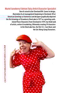 Created by MURIEL FAHRION (me) a character of myself on a color 4X6 Postcard. High Quality stock and printing. It will be hand signed on the front with a Bio and Color of me on the back. Comes with 3" Button of Juneberry Smoothie.