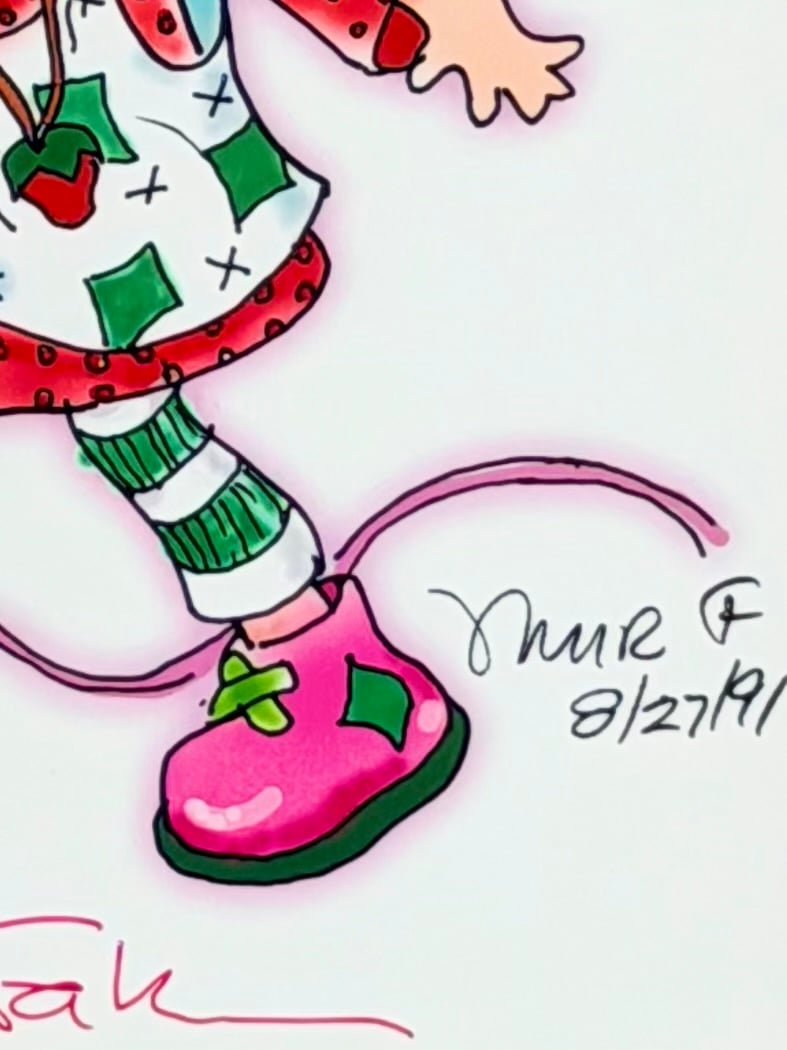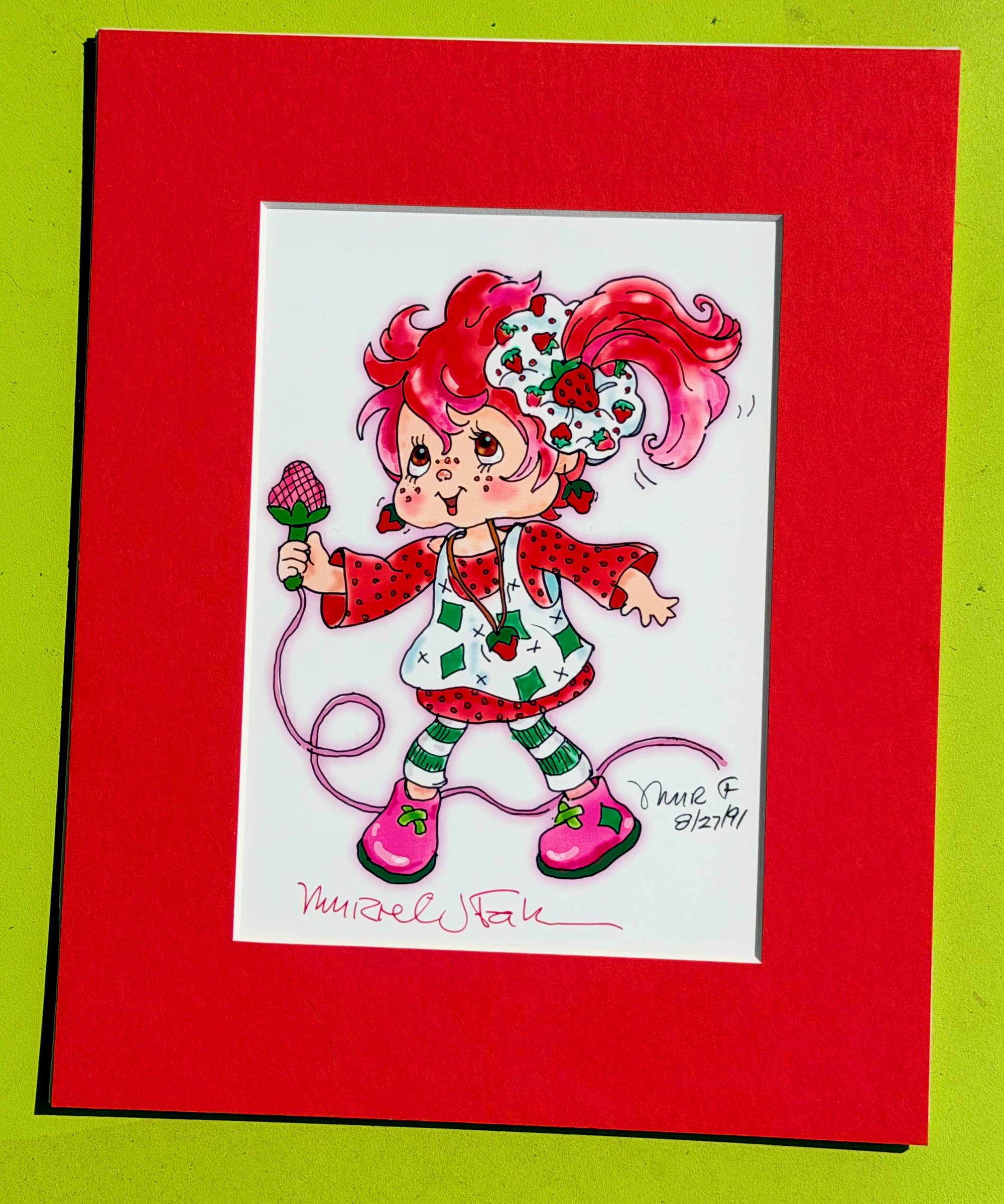 I did this illustration the last year I worked at those characters in Cleveland a.k.a. TCFC. The idea was bringing her into the new age. It was 1991. Karaoke was just being introduced into the US and there she was with a strawberry microphone ponytail on the side held together with a scrunchie. On her feet are pink doc martens FYI Doc Martin’s didn’t have pink ones back then! She had strawberry earrings as well. In my archive, I had the original black line drawing and a marker rendering in color. It was 2019 when I resurrected her using my computer to update her color. It is signed in the print 8/27/91 Mur F. I sold some prints in 2019 in 2020.? I’m running this print again. She’s now in a brilliant red custom mat more expensive than the standard red, but she’s worth it! 10 are available because that's the number of TRUE RED mats I have available . #EverythingOldIsNewAgain #CharacterSpecialist.